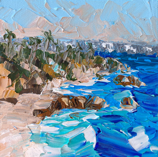 PALMS, ROCKS, BEACH 15x15 cm acrylic on canvas original painting