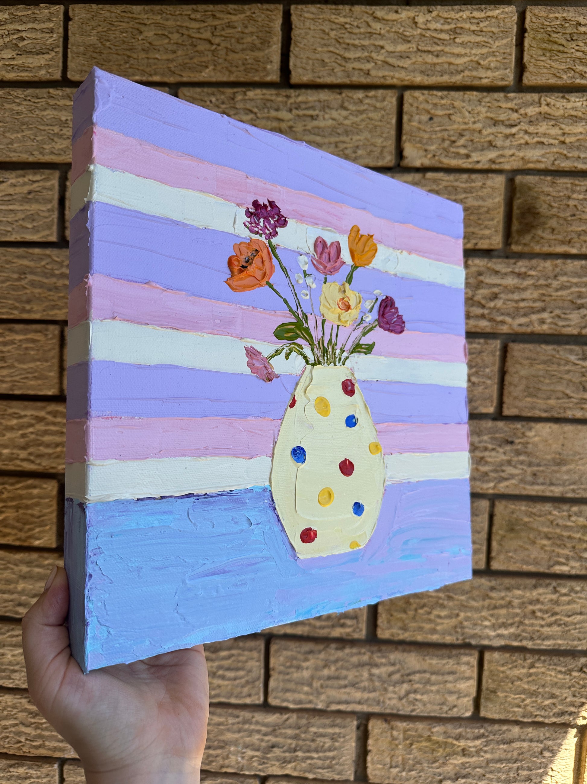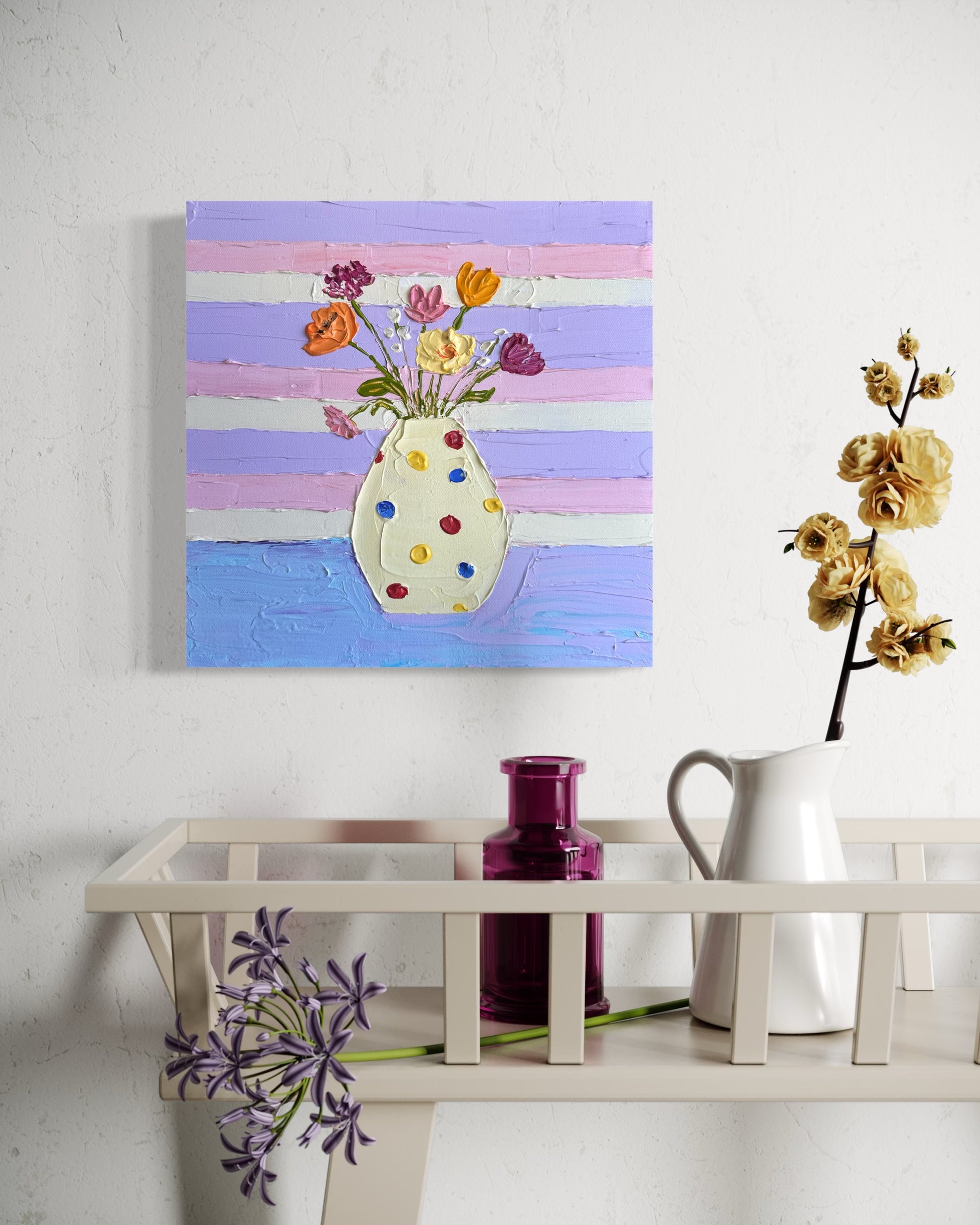 This small painting captures a lively bunch of purple, pink, and yellow flowers arranged in a playful polka dot vase. Resting on a table, the bouquet is framed by a pastel striped backdrop in shades of violet, and pink. The combination of cheerful colors and bold patterns creates a joyful, modern still life that feels both fresh and inviting. Perfect for collectors who love contemporary floral art with a whimsical touch.
