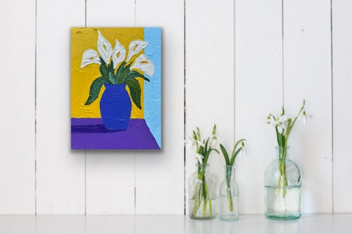 This still life painting features elegant white calla lilies arranged in a blue vase. The flowers stand out beautifully against a cheerful yellow background, while the purple table adds a bold, modern contrast. Clean shapes and gentle color harmony create a bright, uplifting atmosphere. Simple yet striking, this piece celebrates the timeless beauty of calla lilies and the joy of vibrant contemporary design.