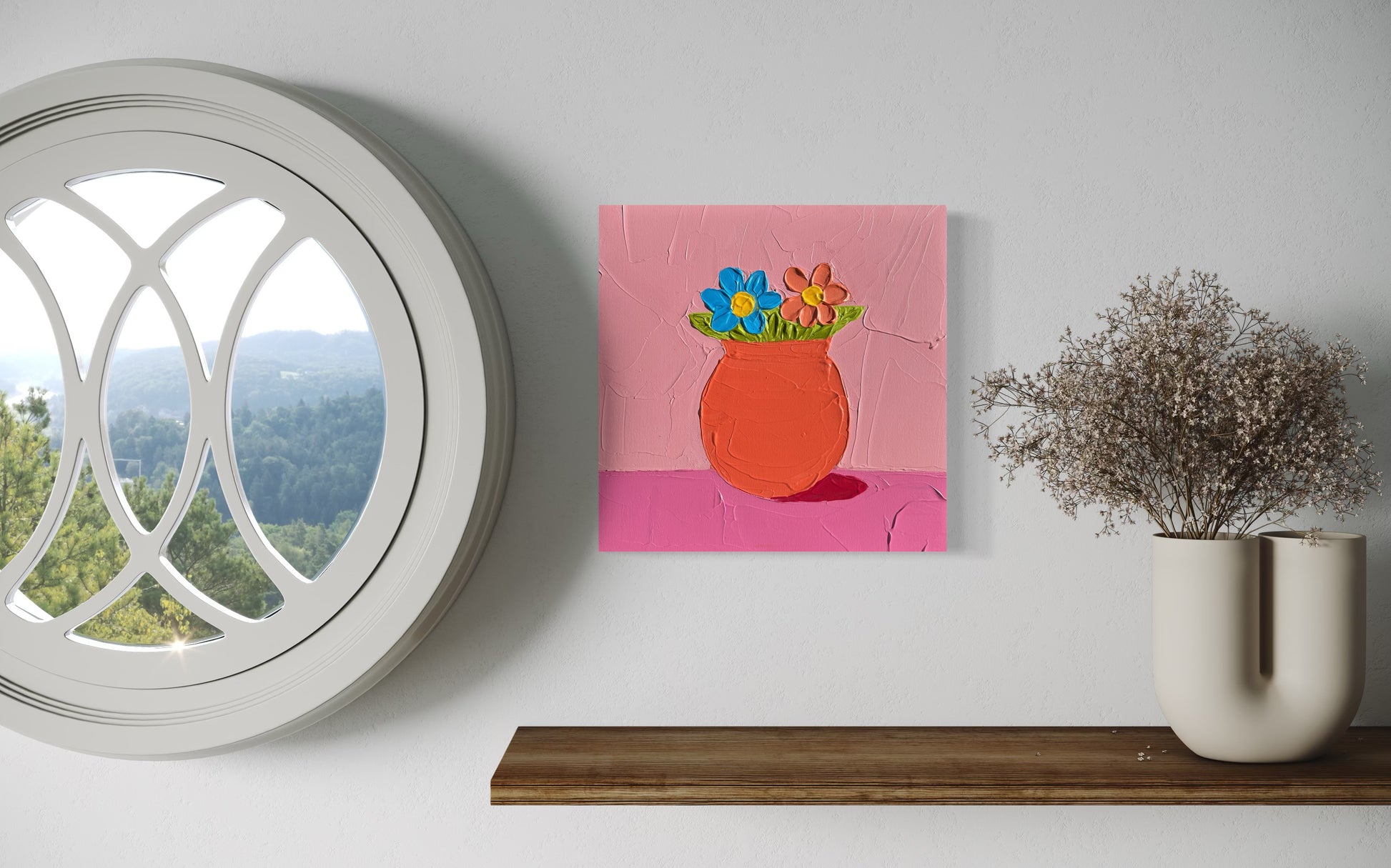 Nana’s Flowers is a vivid, textured painting that radiates warmth, nostalgia, and joy. A simple clay orange vase cradles a cheerful bouquet of bright flowers, brought to life through rich color and expressive texture. The artwork captures the comforting beauty of everyday moments—like the familiar sight of fresh blooms on a loved one’s table. With its playful yet heartfelt charm, this piece invites viewers to pause, smile, and feel the quiet happiness of home.
