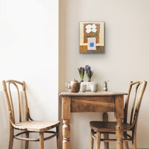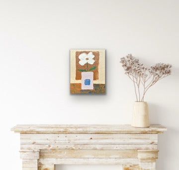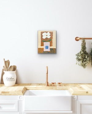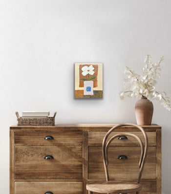 This small still life painting features a single white flower placed in a lavender-grey square vase, set against a warm neutral earthy brown background. The soft color palette and gentle contrasts create a calm, grounded atmosphere. Subtle textures and simple forms highlight the quiet beauty of everyday objects. This piece brings a sense of balance, warmth, and understated elegance—perfect for lovers of minimalist and natural-toned decor.